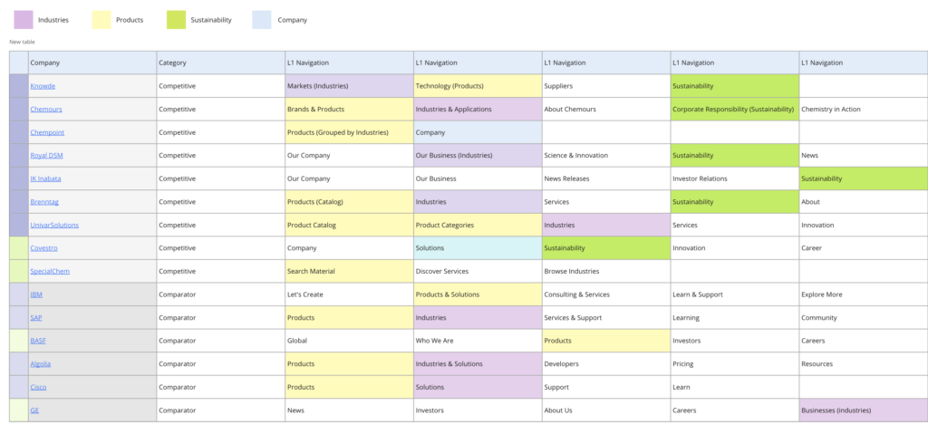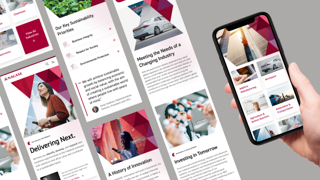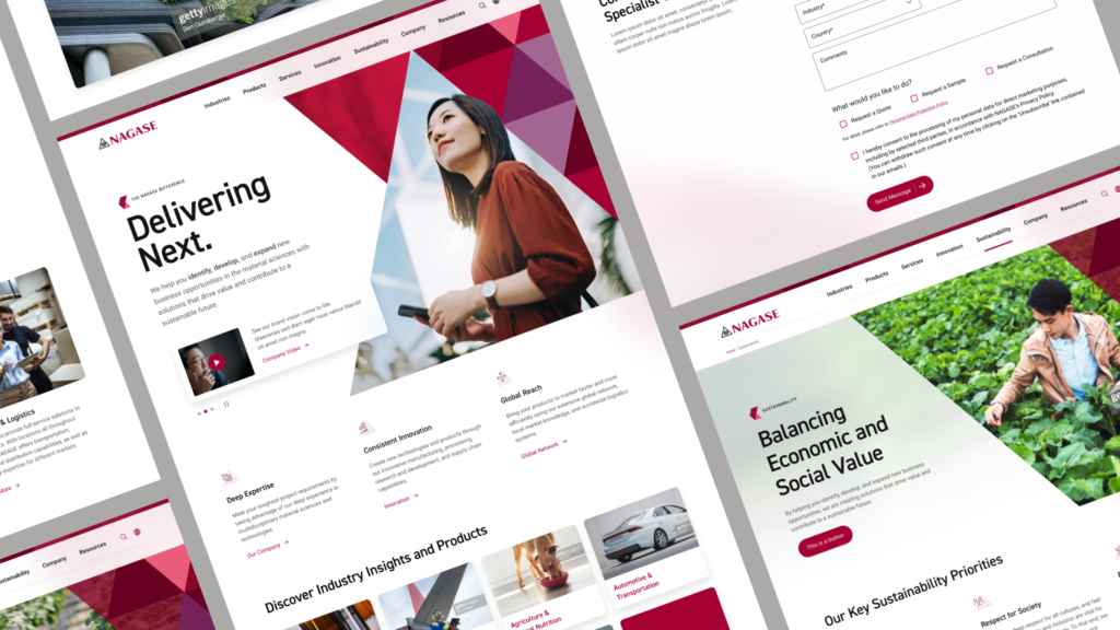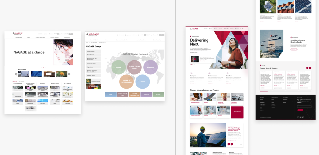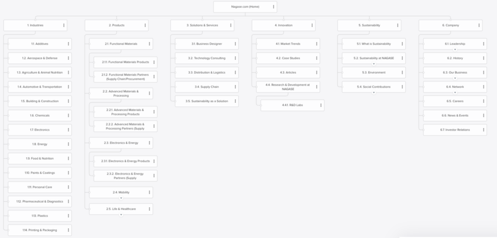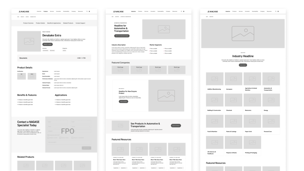 Simultaneously with the audit, our team crafted the information architecture, serving as the groundwork for the sitemap. This information architecture seamlessly integrated the findings from the audit, personas, and business objectives, resulting in the creation of main landing pages like Industries, Products, Solutions, and Innovation. Each of these key landing pages was strategically aligned with the specific needs of different persona types when visiting the Nagase website. Once the foundation for the sitemap was established, our team proceeded to develop wireframes and set up templates that defined the design system, laying the groundwork for the visual team’s further contributions