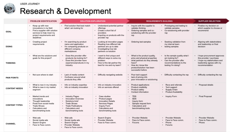To kick off the creative process, we started by identifying our target audience. We crafted personas to gain a comprehensive insight into the goals and needs of visitors to the Nagase website, with a particular focus on engineers, executives, and research & development roles. Subsequently, we mapped out each persona's customer journey, enabling us to discern the necessary content and prioritize it for the redesign. It became evident that featuring product categories and industry-specific pages played a crucial role in assisting our diverse audience in finding the desired content effectively.